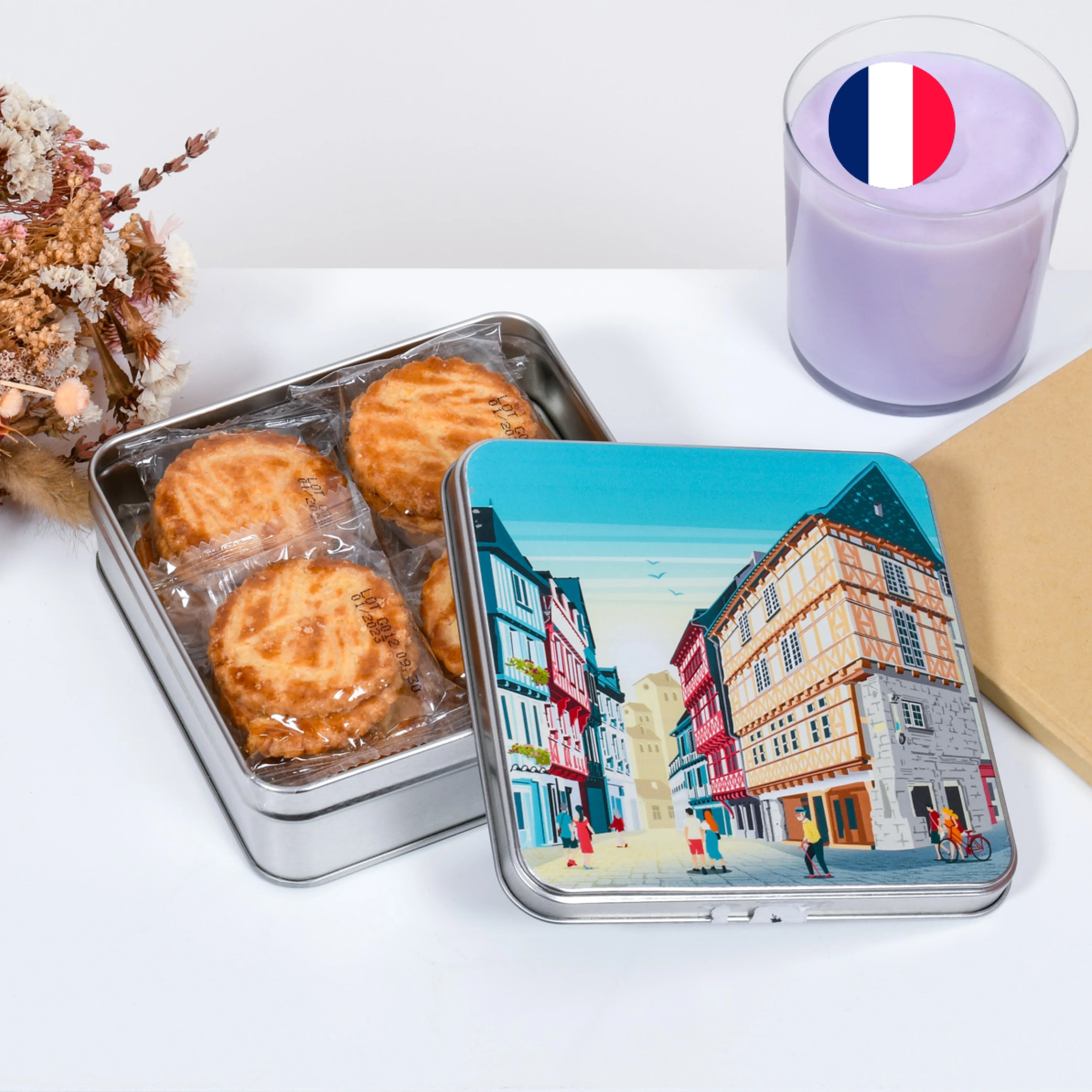La Boîte avec galettes pur-beurre personnalisée contient : galettes pur beurre français, boîte carrée coloris silver, impression numérique personnalisée sur couvercle.