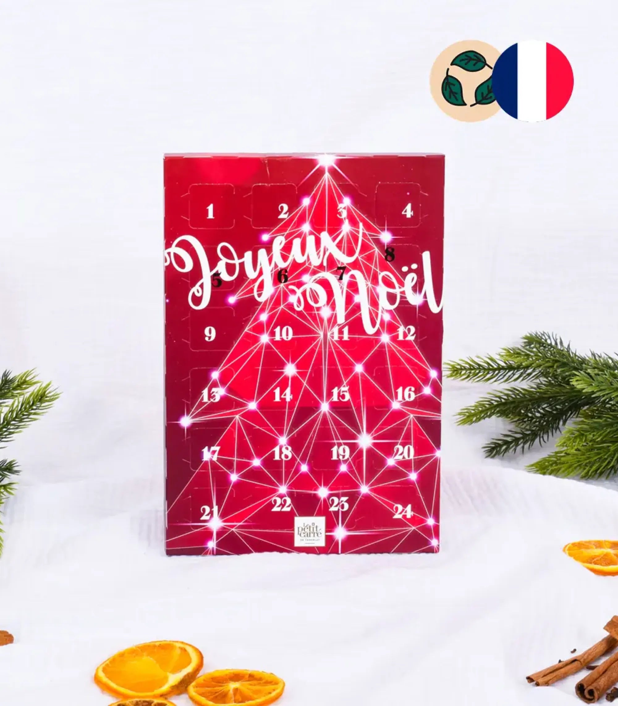 Le Calendrier de l'avent chocolat propose gourmandise : 25 tiroirs, chocolat noir 71% cacao, fabriqué entièrement France, carton FSC recyclable.
