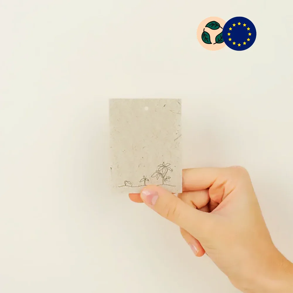 L'étiquette écologique personnalisée est le marquage produit durable et responsable pour valoriser vos articles : papier 100% recyclé certifié FSC, dimensions 7,5 x 5,5 cm, adhésif compostable, impression quadri haute définition, fabrication française.