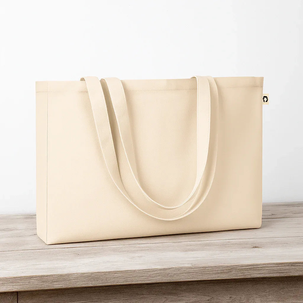 Le grand tote-bag en toile recyclée est le sac shopping robuste et éco-responsable pour vos équipes et événements : coton recyclé haute qualité 280 g/m² avec doublure intérieure, dimensions 49 x 9 x 37 cm, longues poignées renforcées.