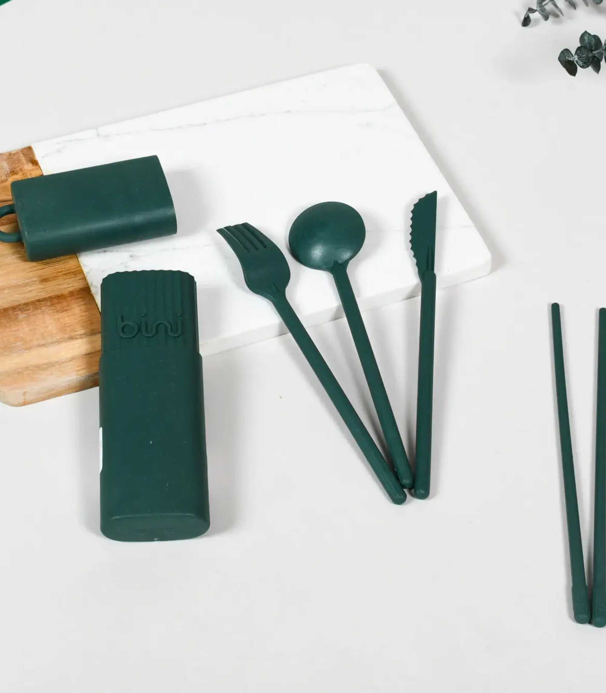 Le Kit de couverts en matière recyclée Bini comprend : fourchette, couteau, baguettes, cuillère, bio-composite circulaire 40% fibres bois déchets restaurant, fabriqué France.