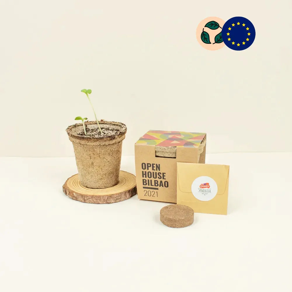 Le kit de plantation en fibre de coco est le cadeau écologique complet 100% compostable pour vos collaborateurs et clients : pot en fibre de noix de coco biodégradable, pastille de tourbe, graines biologiques sélectionnées, emballage papier FSC, dimensions 7,5 x 7,5 cm.