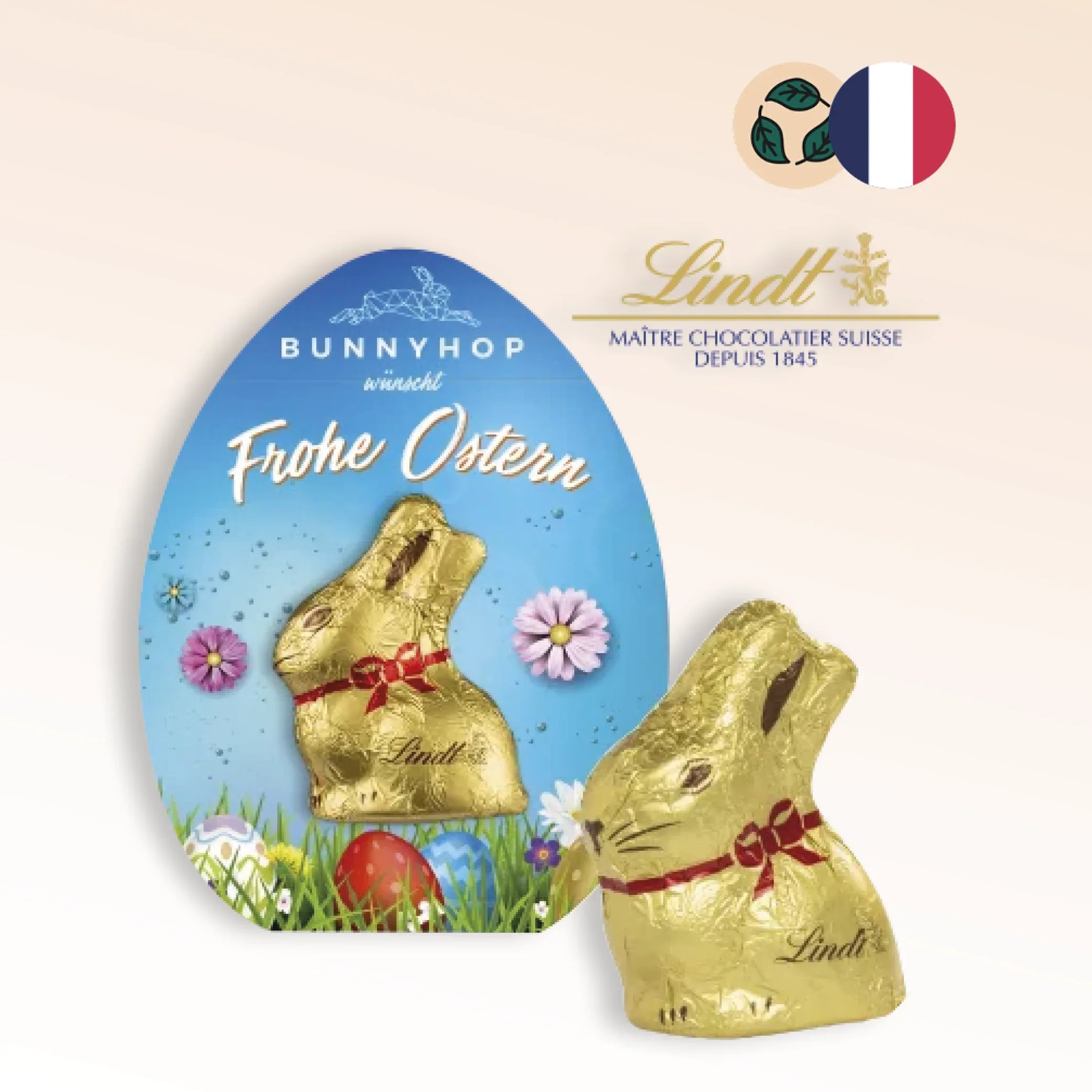 Le mini lapin de Pâques Lindt personnalisé est le cadeau festif premium pour vos clients et collaborateurs : chocolat au lait Lindt premium, dimensions 8 x 10,5 cm, emballage boîte œuf certifié FSC personnalisable, fabriqué en France.