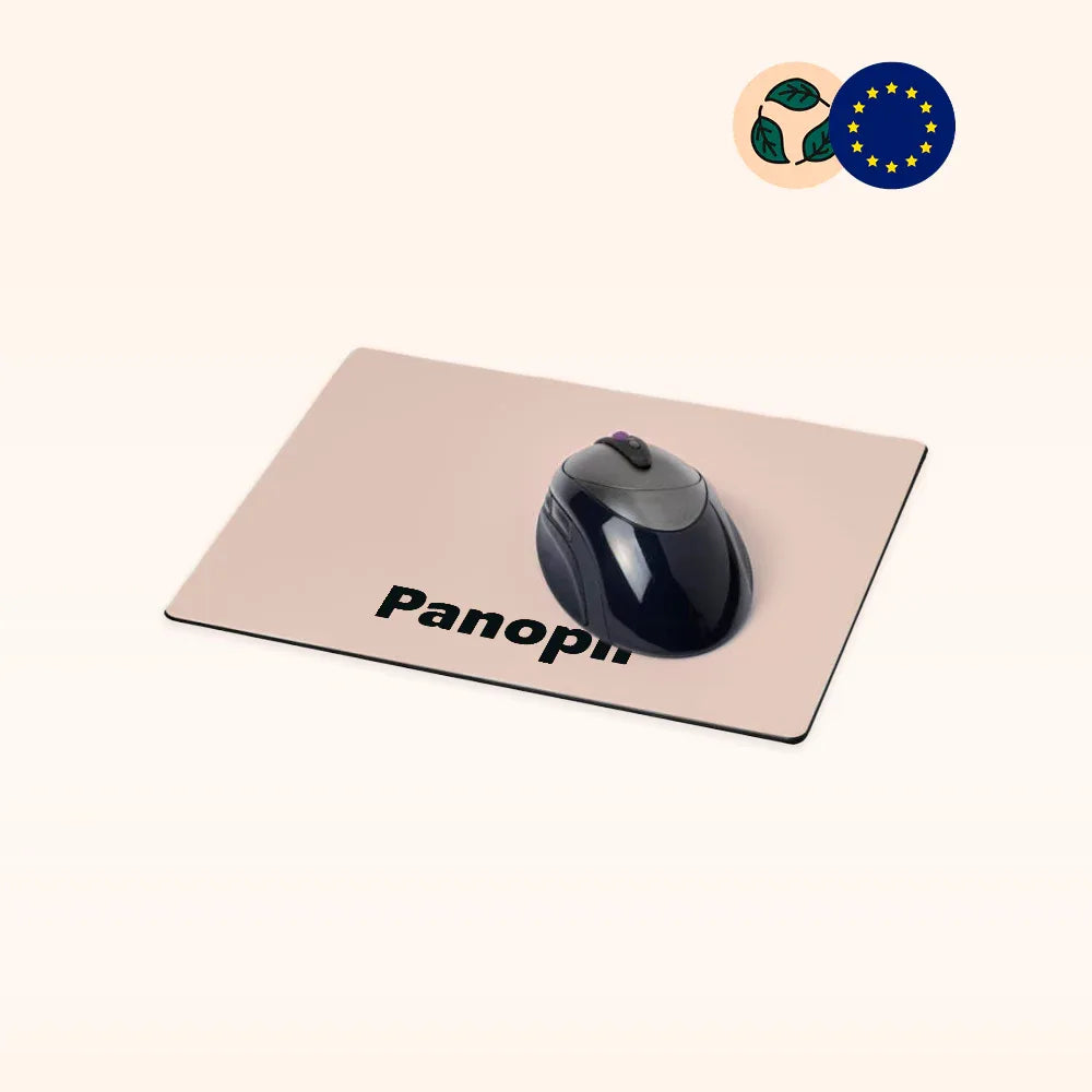Le petit tapis souris écoresponsable personnalisé est l'accessoire bureau compact : plastique recyclé rigid technique brevetée, étiquetage intégré moulage, 22x18cm format standard, Royaume-Uni fabrication.