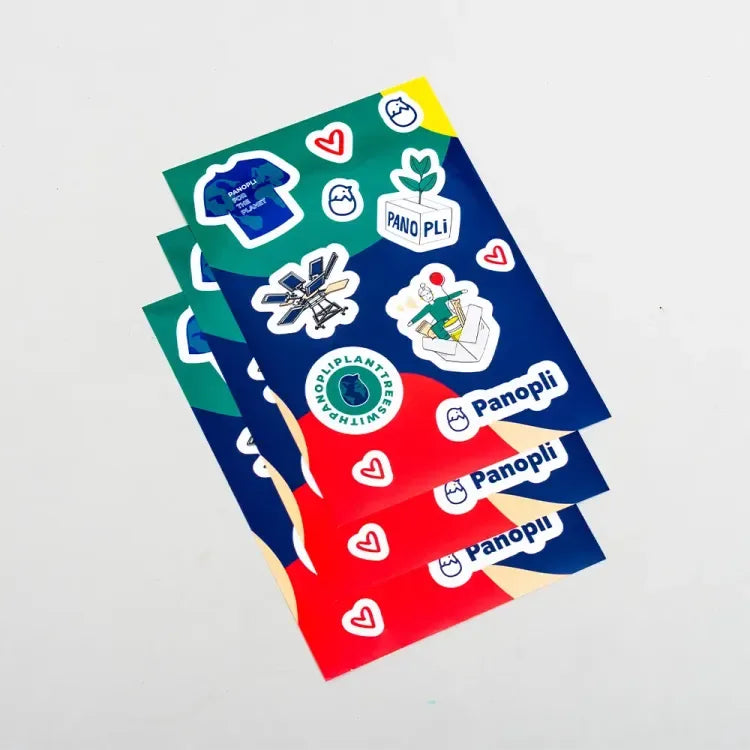Cette planche de stickers en vinyle (format A4 ou A5, 21 x 29,7 cm) est fabriquée en Europe avec impression numérique pleine couleur sur votre design complet. Elle permet de distribuer plusieurs déclinaisons de votre identité graphique en un seul support : logos, icônes, personnages, slogans, chaque planche est une mini-galerie de votre marque. Idéale pour les goodie bags et les kits d'onboarding. Dès 25 planches, délai 7 jours.