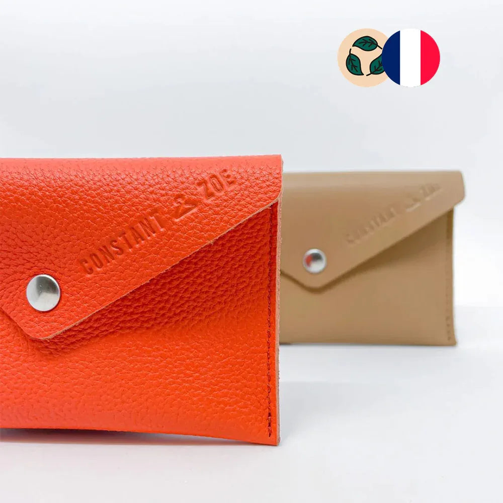 Le porte-cartes en cuir upcyclé est l'étui compact français : cuir upcyclé soutien personnes handicapées vêtements, format cartes pratique, rangement argent documents, fabrication France inclusion sociale.