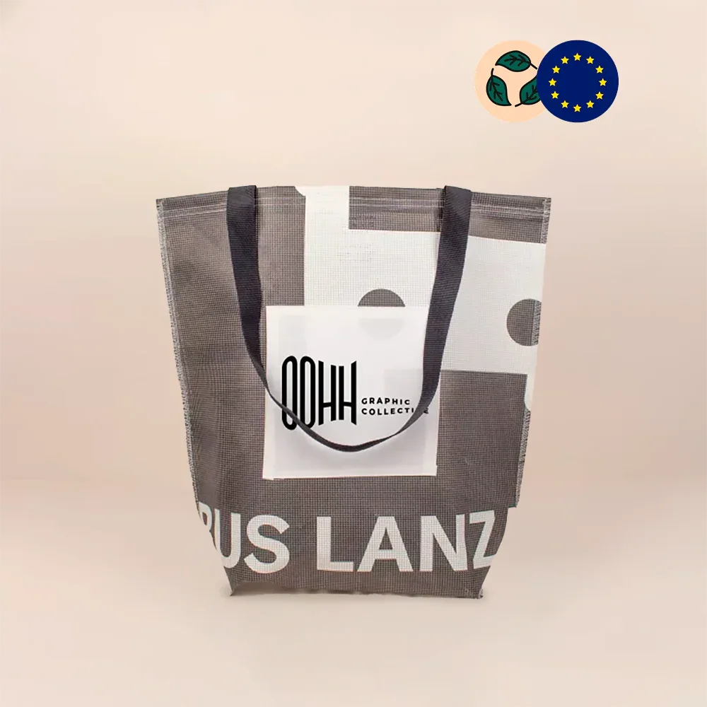 Le sac recyclé personnalisé est l'accessoire unique issu de l'économie circulaire : bâche publicitaire PVC 100% recyclée, dimensions 40 x 40 cm, motifs uniques garantis (jamais deux sacs identiques), fabrication française.