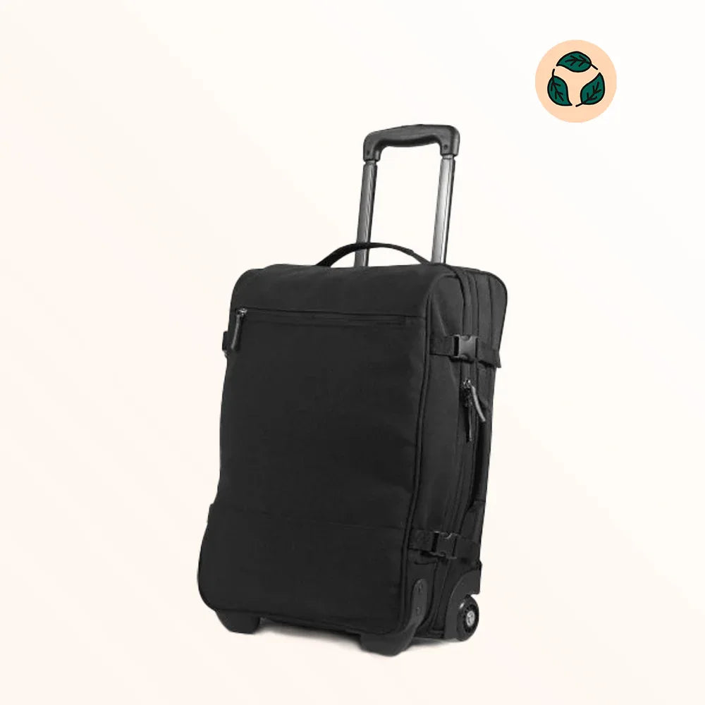 Le sac trolley en PET recyclé personnalisé est la valise souple éco-conçue pour les voyages professionnels responsables : PET recyclé issu de bouteilles post-consommation, dimensions 55 x 35 x 20 cm, tirette télescopique, compartiment principal + poches multiples.