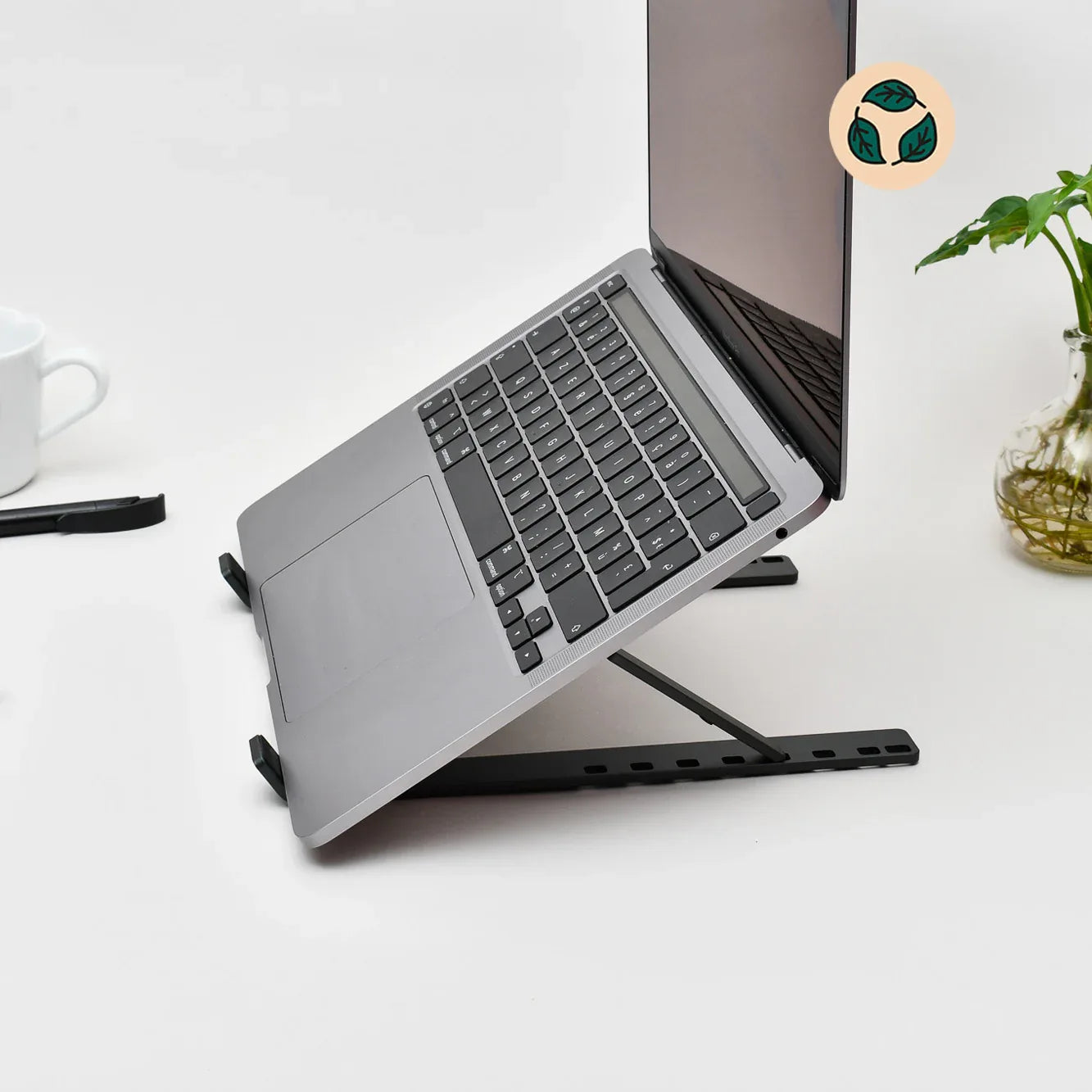 Le Support d'ordinateur en aluminium recyclé personnalisé est un support pour ordinateur portable ou tablette : aluminium recyclé certifié RCS, TPU, contenu recyclé total 99% du poids total.