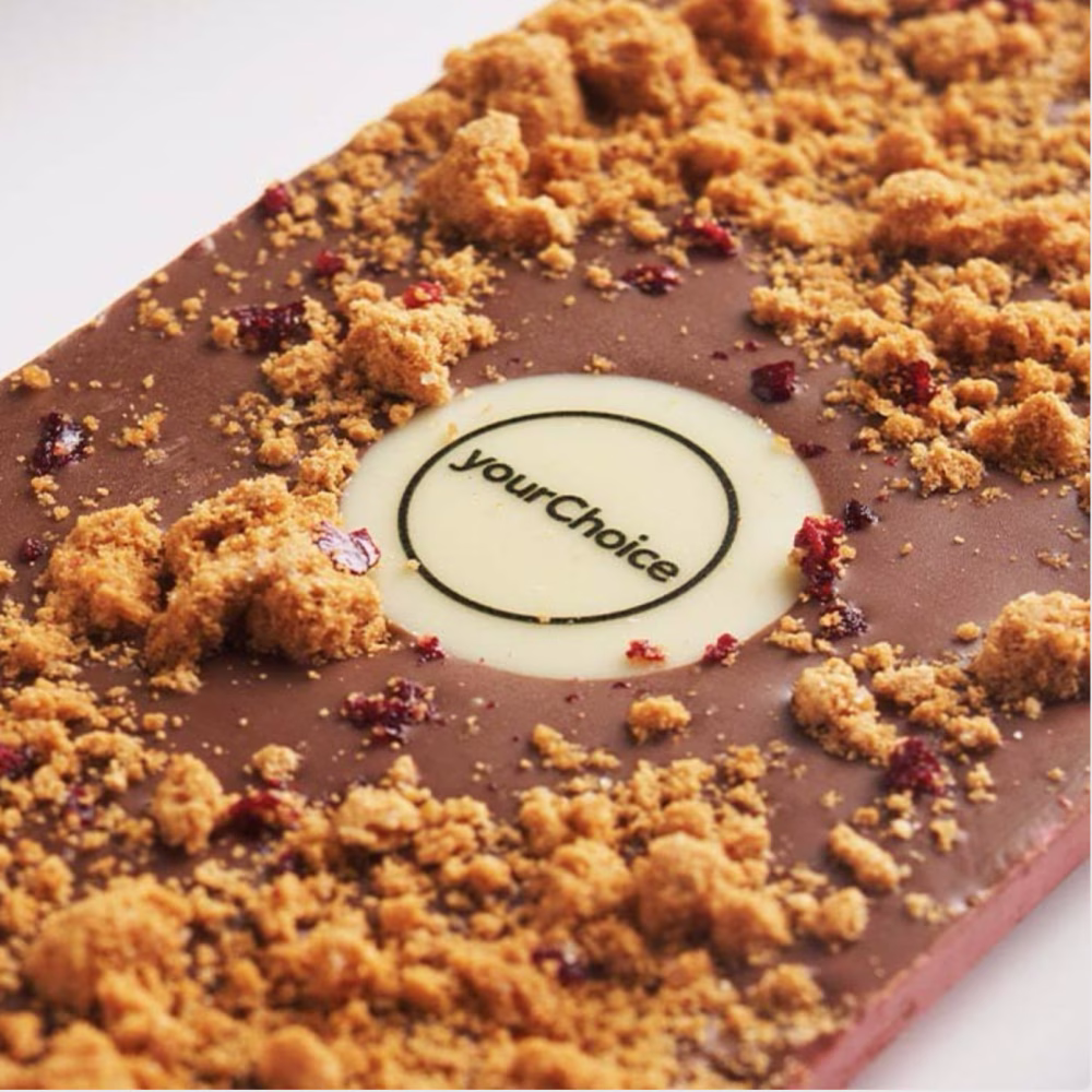 🍫 Une tablette de chocolat (95g) garnie de spéculoos et cerises croustillantes, avec votre logo en chocolat (⌀ 3 cm)