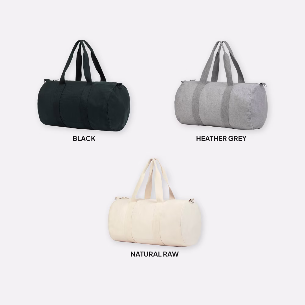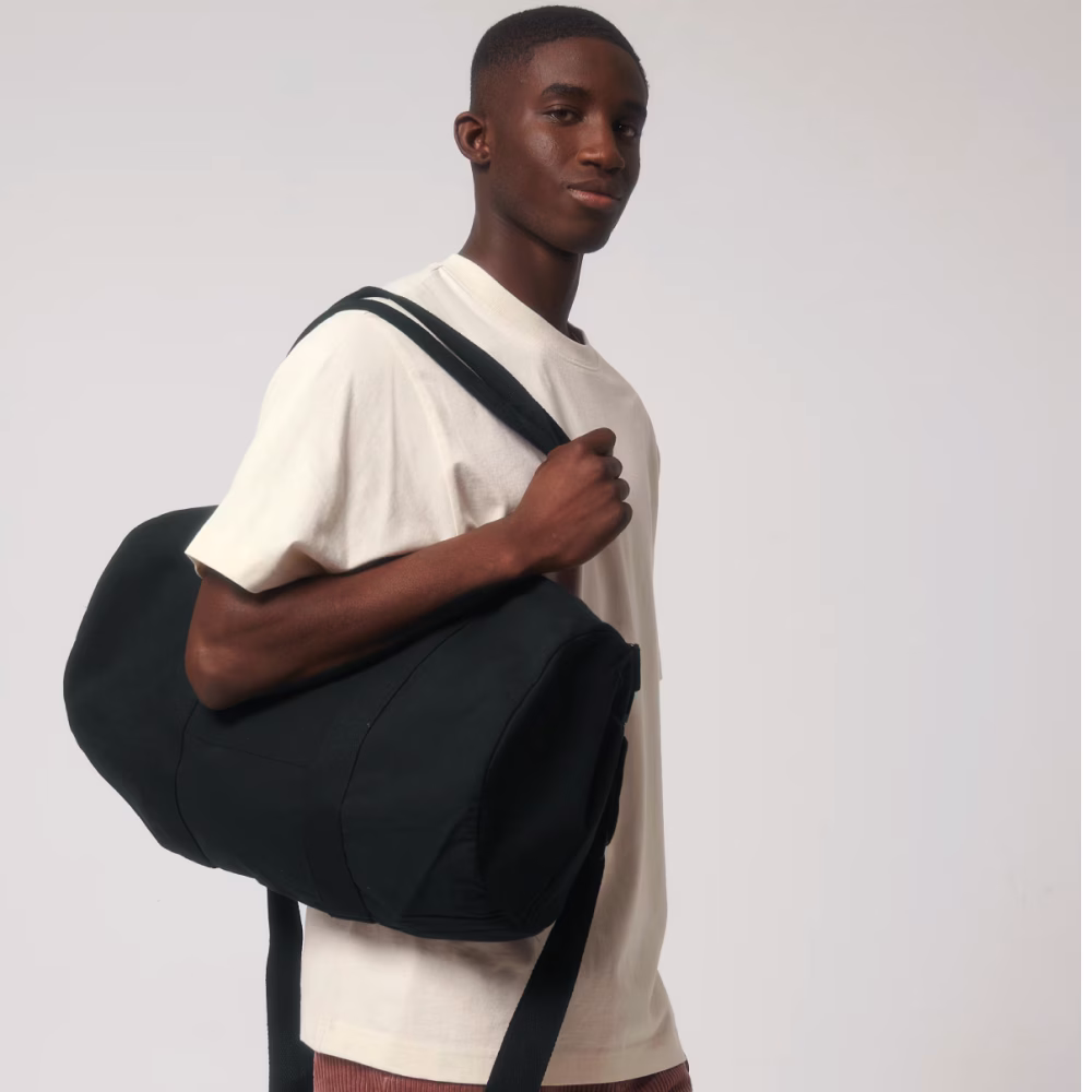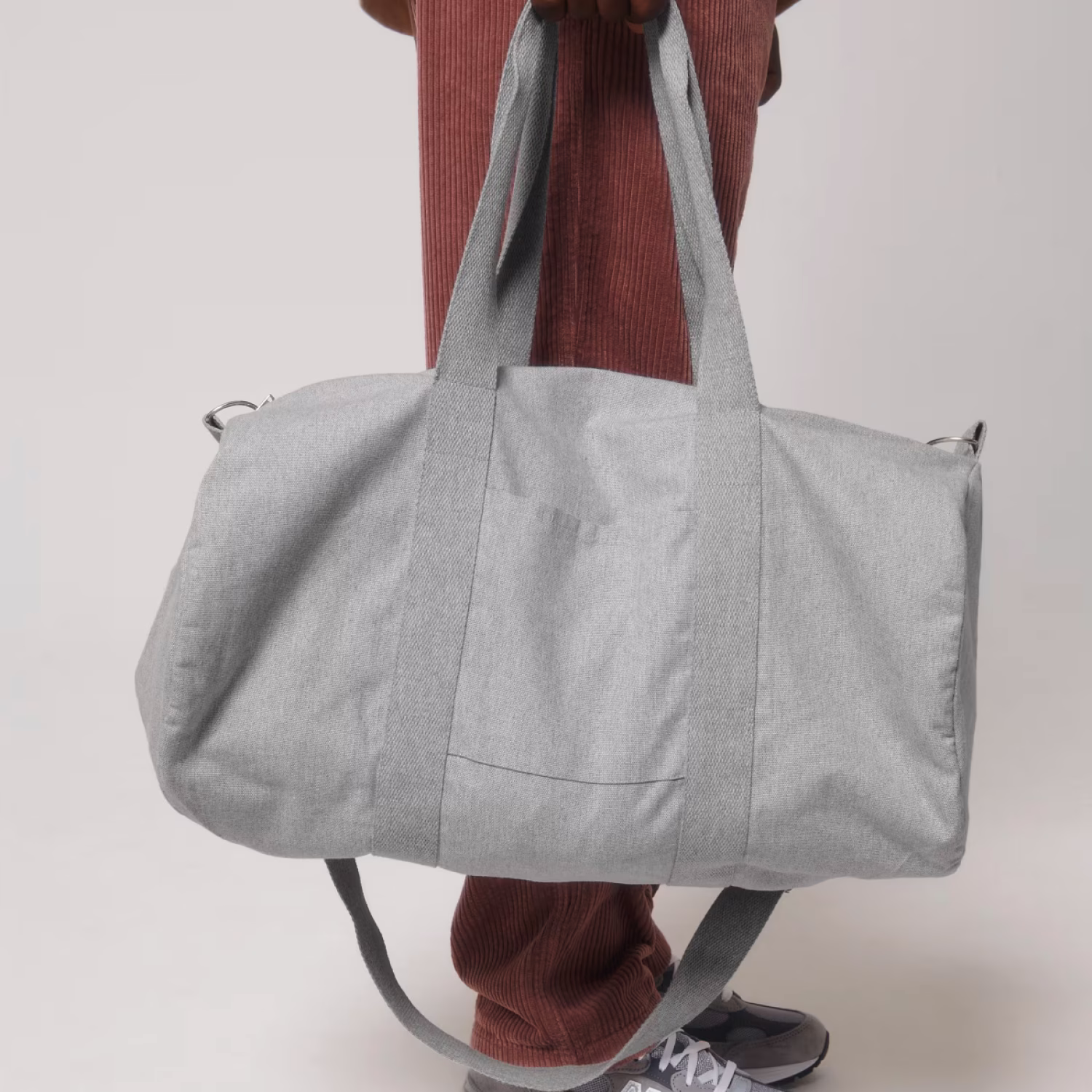Sac de sport ou de voyage en toile recyclée, avec anses en gros grain et bandoulière amovible. Un modèle pratique et résistant, adapté à un usage quotidien.